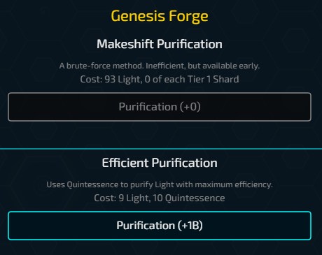 2. I can not click on the second Button in the Pristine Light conversion Menu where it says "Efficient Purification" with Quintessence - even though I would get "+1B" at the moment and have all of the board allocated (The 9 Color nodes as well).