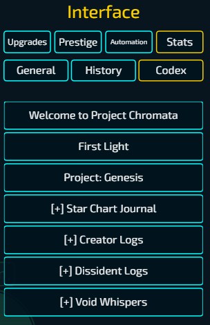 cool game for the most part. kind of a time-waster at the very end after all of the star chart upgrades are bought, just left hanging in the background(oh, and to the point of a previous commenter, by background i just mean in the corner of my screen, since leaving the tab does bizzare things). Also, the 'Project: Genesis' text was not scrollable so i didn't see the directive. So i wanted to check in the codex, and it was equally unscrollable. ugh. to be clear, im playing on the web version, so such errors may be web exclusive, idk.