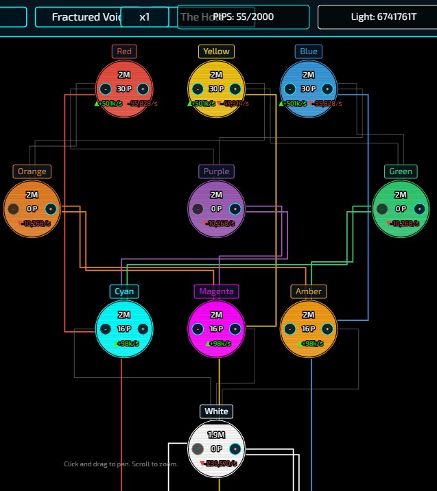 1. Auto-Reset of production when switching tab or minimizing Window For some reason there is an "auto-reset" of all colors and mixers once you change the browser tab or minimize the window. (Might be due to preventing the "Cheat" with "getting all tanks full in a blink of an eye" (Offline Calculation)) And that's basically no problem, it just bothered me once I tried to collect more Pristine Light as I minimized sometimes while allocating the tiles and didn't notice, that the production was completely off for several minutes.