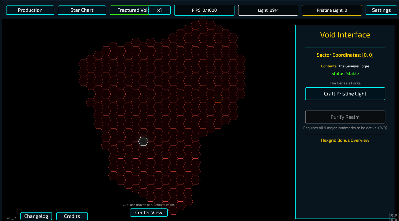 Implementations that'd be awesome: maybe when undergoing efficient purification, you could control how much pristine light you want to make, so as not to drain the entirety of your light reserves (therefore keeping passive light gain from structures optimal). Also, as others have mentioned, it is a bit of a chore exploring and then stabilizing the fractured void, it would be a tremendous boon to the game if you could allow a keybind to explore/purify a sector, and also allow arrow keys to move your highlight between sectors. Also, it seems as though upgrading Void Nexus structures past level 2 is impossible for some reason (at least on the web version) and the void Nexus structures further from the forge are impossible to upgrade even once after activation.